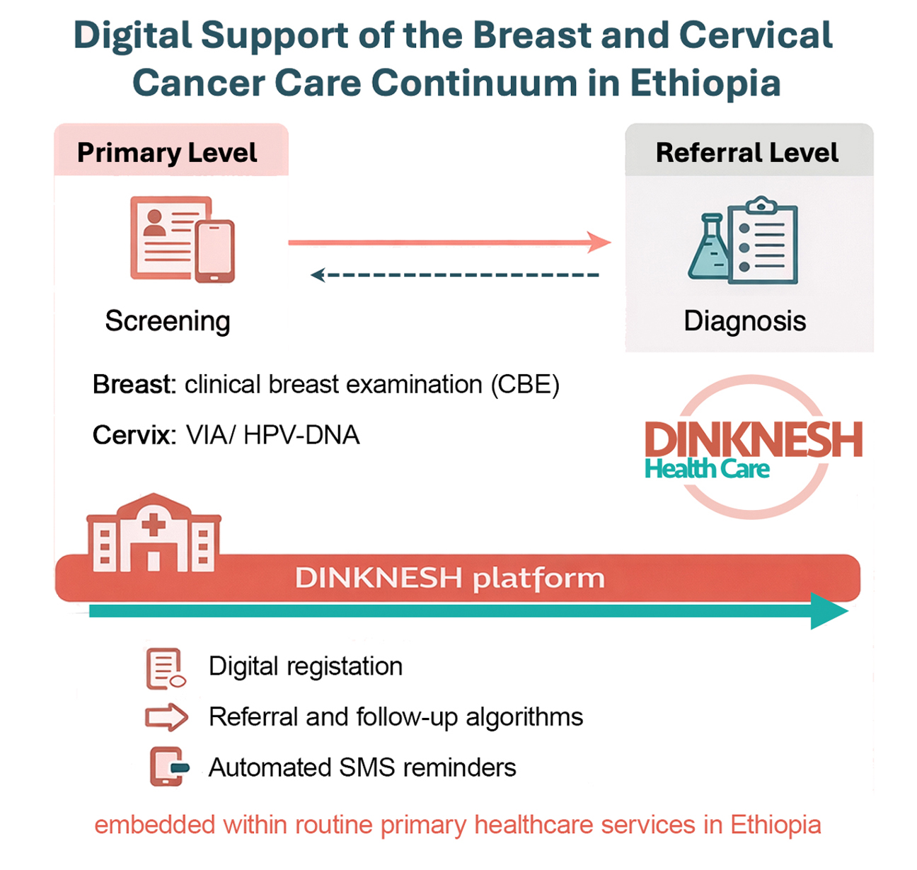 To address these challenges, the Digital Global Health Working Group has developed the DINKNESH App—a context-adapted digital platform designed to support coordinated, patient-centered care across the cancer care continuum. The app is embedded within routine primary and secondary healthcare services and developed in close collaboration with Ethiopian health authorities, healthcare workers, and local technical partners.