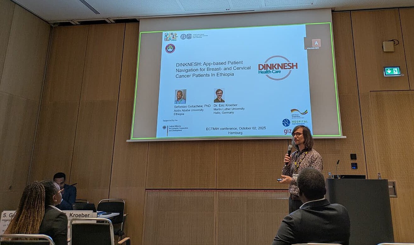 Dr. Getachew und Dr. Kroeber stellten das DINKNESH-Projekt (Developing International Research Collaboration in Ethiopia to Support Oncology at Primary Health Care Levels) vor, das ein App-basiertes Patienten-Navigationssystem entwickelt, um die Brust- und Gebärmutterhalskrebsversorgung in Äthiopien zu verbessern. Die mobile und webbasierte Plattform ermöglicht die Nachverfolgung von Patienten, die Koordination von Überweisungen und die digitale Nachsorge in primären und tertiären Gesundheitseinrichtungen.