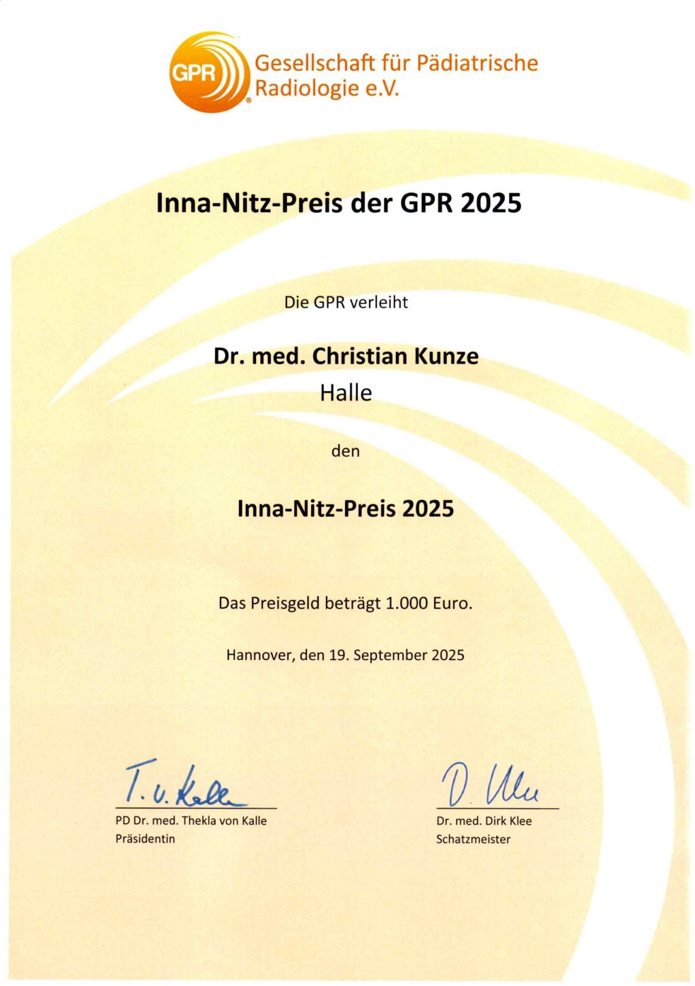 Inna-Nitz-Preis (für gute Ausbildung) der Gesellschaft für Kinderradiologie