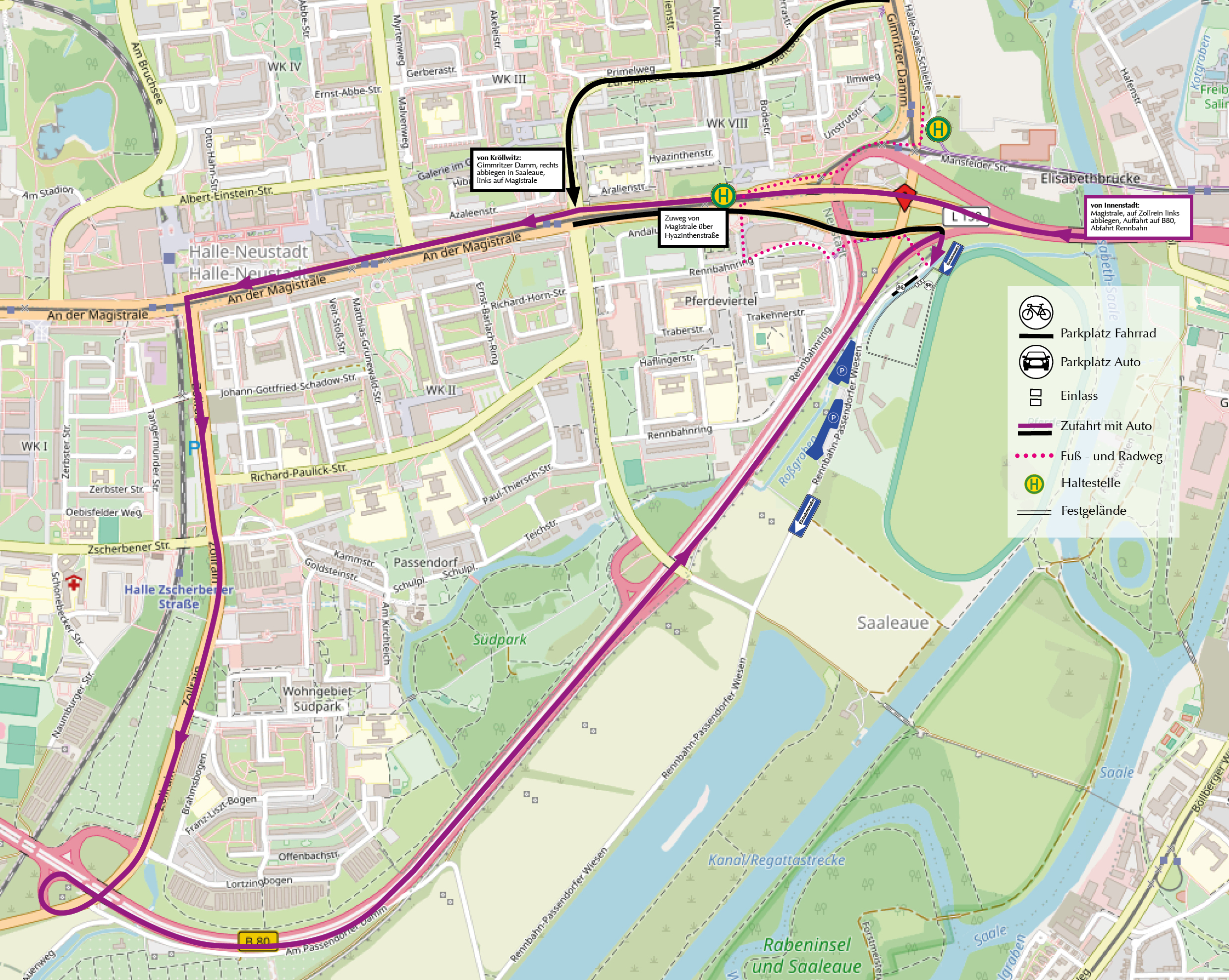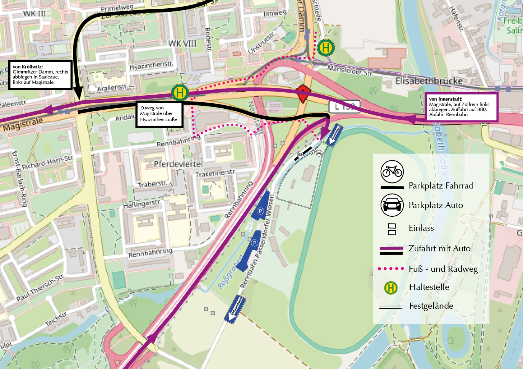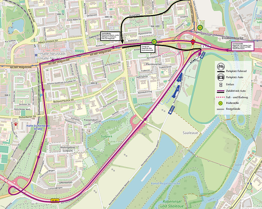 - aus Richtung Norden (Kröllwitz usw.): Gimritzer Damm à Zur Saaleaue à Auffahrt Magistrale an der Kreuzung „An der Feuerwache“ à Beschilderung zur Rennbahn folgen