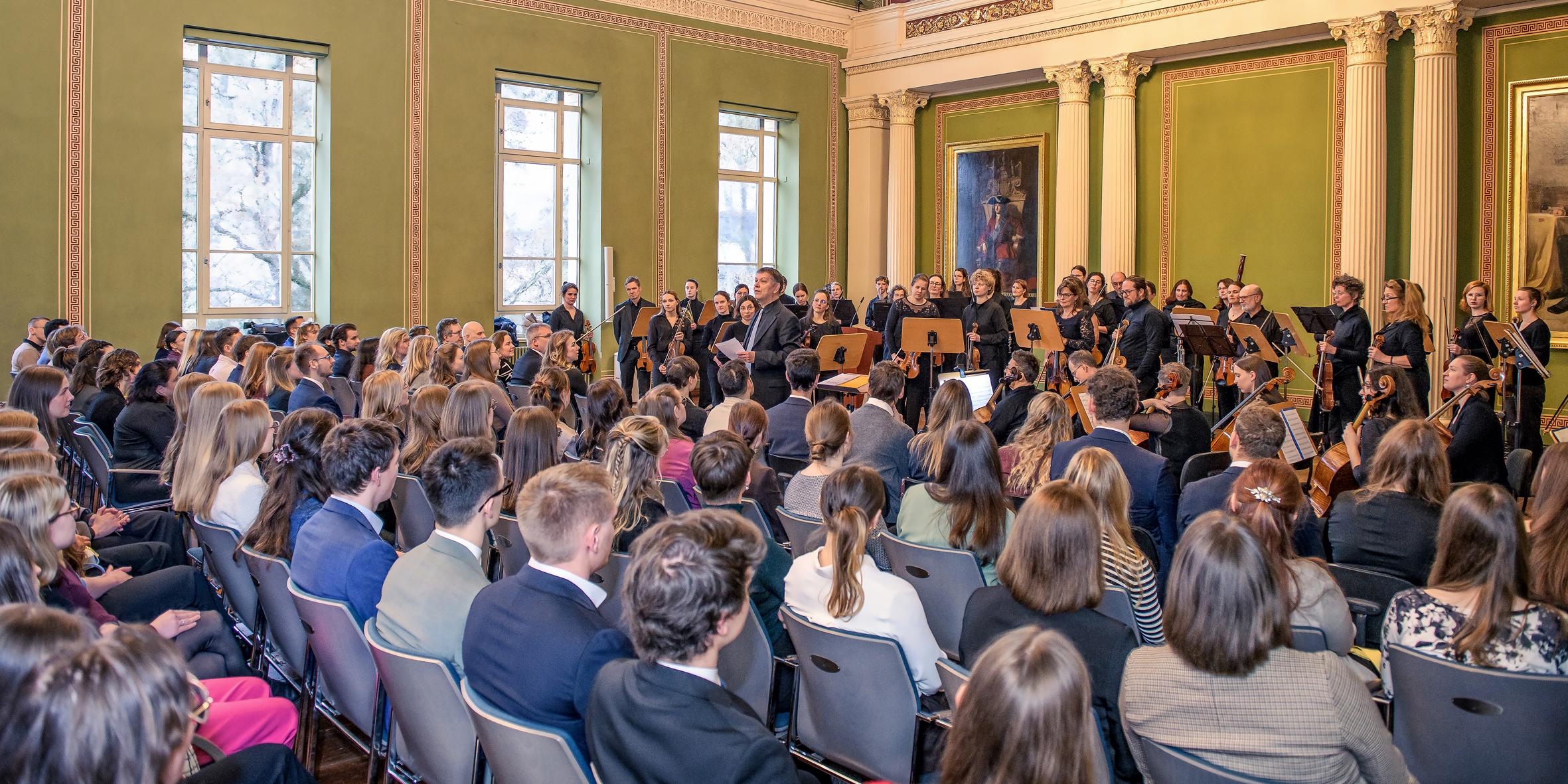 Zum Auftakt spielte das Orchester der Medizinischen Fakultät der MLU unter der Leitung von Bernhard Prokein. Studiendekan Prof. Dr. Rüdiger Horstkorte und Prof. Dr. Uwe Ebmeyer, Präsident der Ärztekammer Sachsen-Anhalt, richteten Grußworte an die Absolvent:innen. Stellvertretend für diese hielt Lea Ruth Ortmann eine Ansprache.