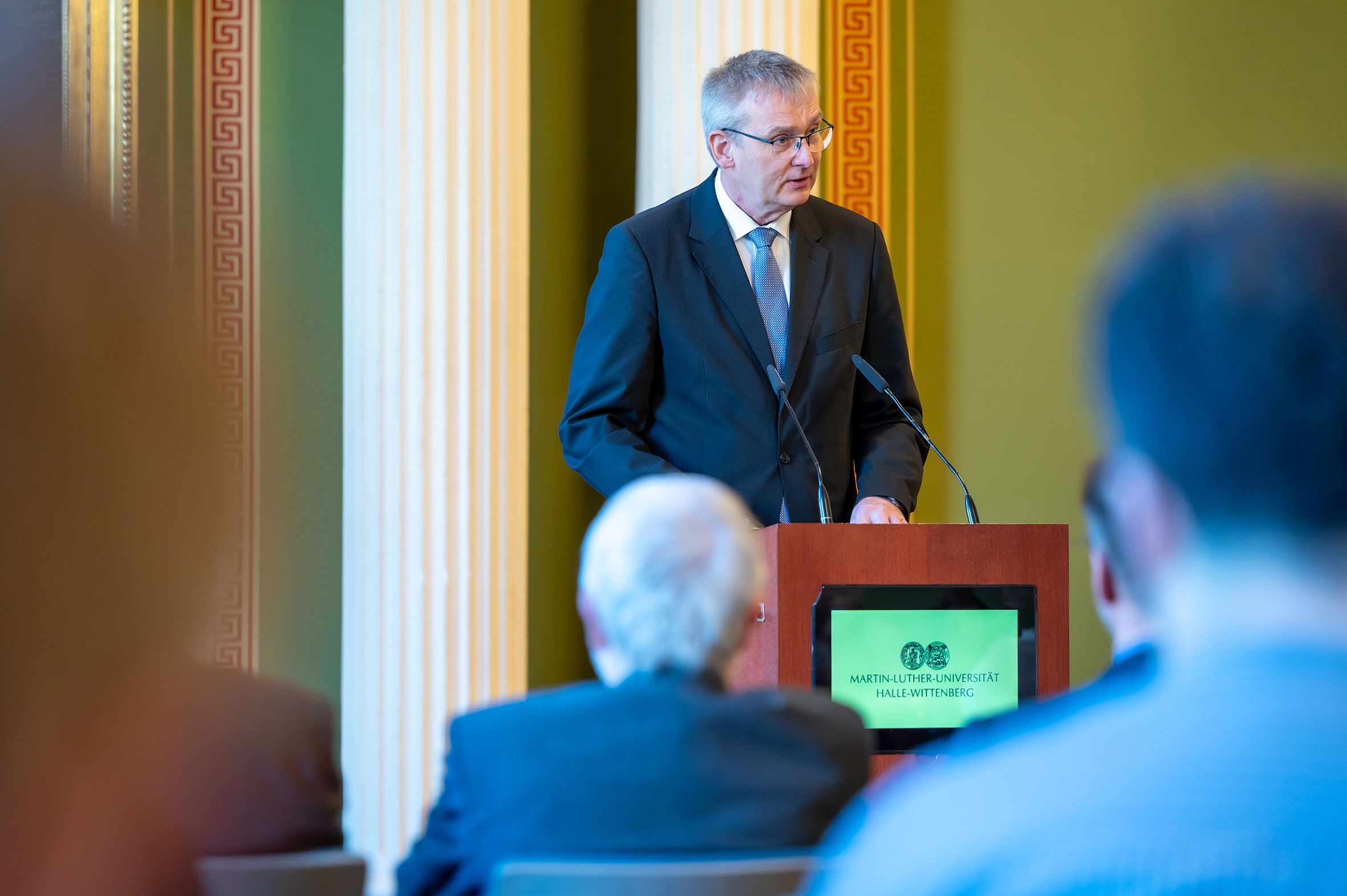 Die Festversammlung wurde mit einem Grußwort von Prof. Dr. Pablo Pirnay-Dummer, Prorektor für Studium und Lehre der MLU, eröffnet. Traditionsgemäß ehrte er die Promovierenden, die mit der Auszeichnung „summa cum laude” abgeschlossen hatten, mit der Luther-Urkunde.