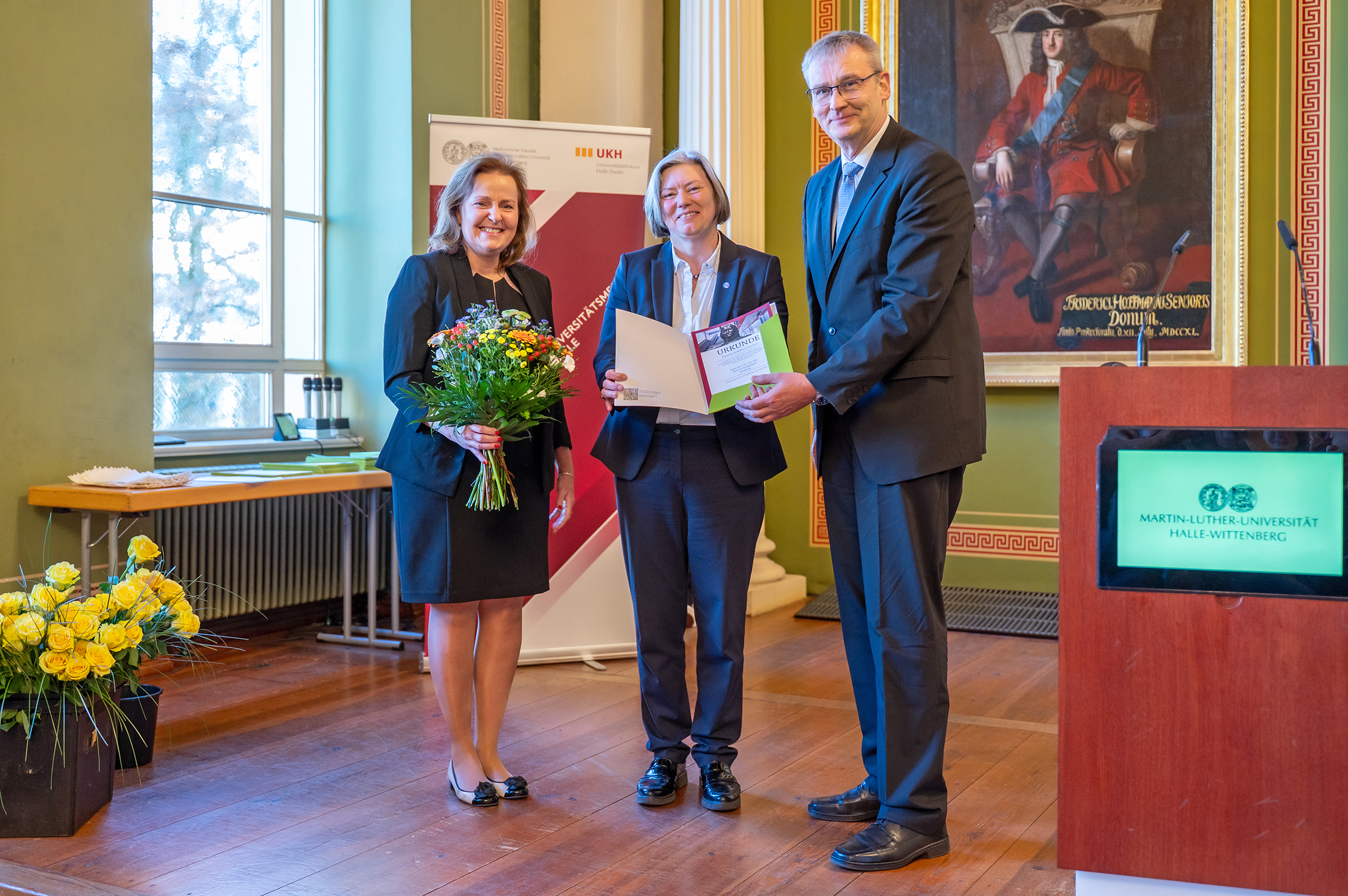 „Die hohe Qualität und große Bandbreite der wissenschaftlichen Abschlussarbeiten zeigen eindrucksvoll die Vielfalt und Leistungsfähigkeit unserer Fakultät. Hinter jedem Werk stehen großer persönlicher Einsatz, fachliches Können und Ausdauer. Ich gratuliere allen sehr herzlich zu diesen wichtigen Meilensteinen. Als Fakultät sind wir stolz auf diese Spitzenleistungen“, erklärt Prof. Dr. Heike Kielstein, Dekanin der Medizinischen Fakultät der MLU.