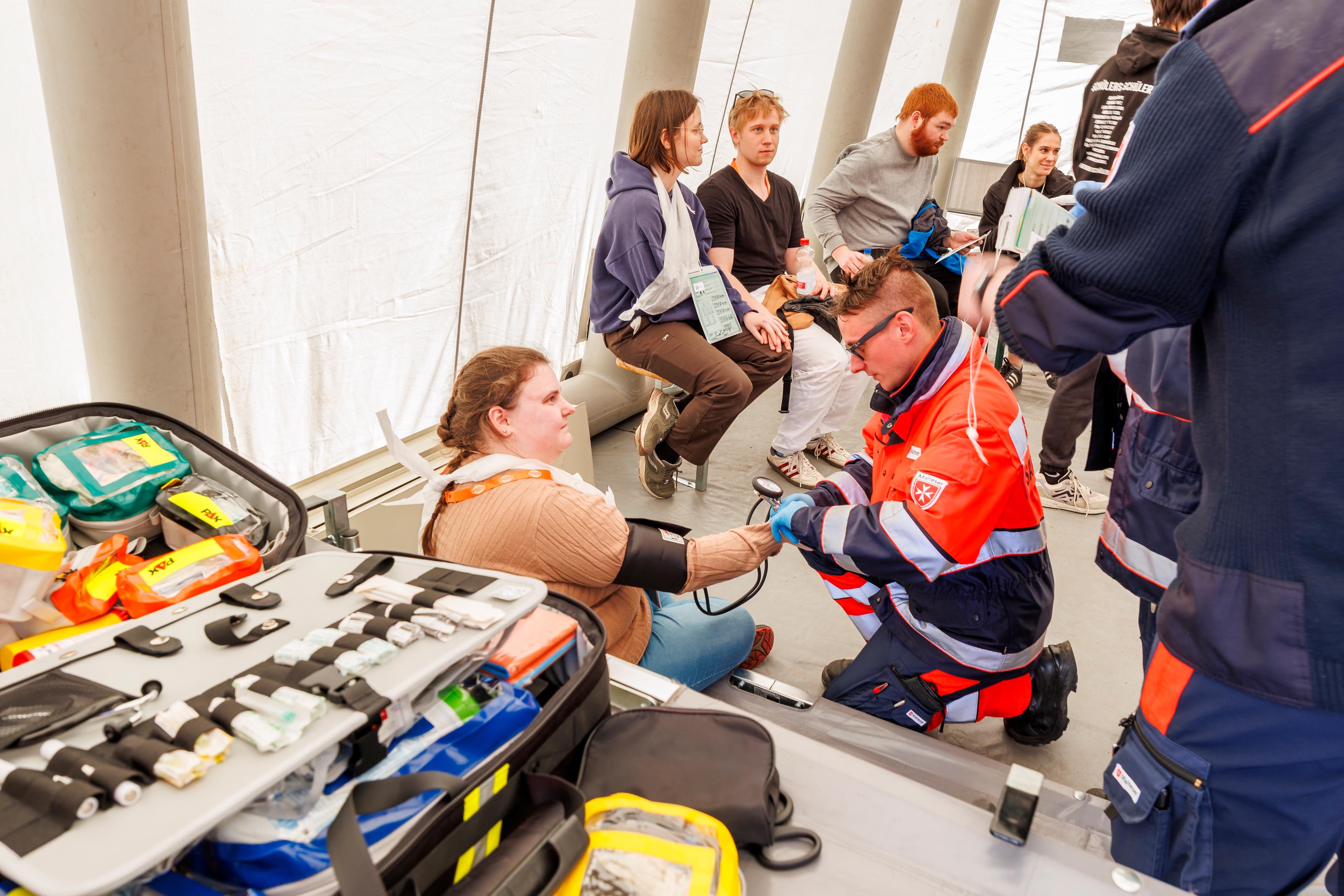 Als die ersten Rettungsteams per Rettungstransportwagen oder -hubschrauber gegen 11 Uhr am Universitätsklinikum Halle (Saale) eintrafen, standen die Mitarbeitenden der Zentralen Notaufnahme (ZNA) und der Universitätsklinik für Anästhesiologie und operative Intensivmedizin schon bereit. Die von Auszubildenden und Studierenden der Universitätsmedizin Halle dargestellten Patient:innen wurden vor Ort gesichtet, nach Schweregrad der Verletzungen kategorisiert und entsprechend medizinisch versorgt.