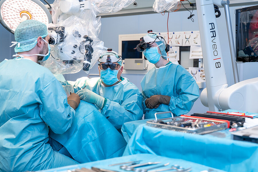 Zwei Männer in grüner OP-Kleidung stehen an den Roboterarmen eines OP-Robotersystems. Im Hintergrund ist ein Bildschirm zu sehen. Das Foto zeigt einen OP-Saal  Zwei Männer in grüner OP-Kleidung stehen an den Roboterarmen eines OP-Robotersystems. Im Hintergrund ist ein Bildschirm zu sehen. Das Foto zeigt einen OP-Saal