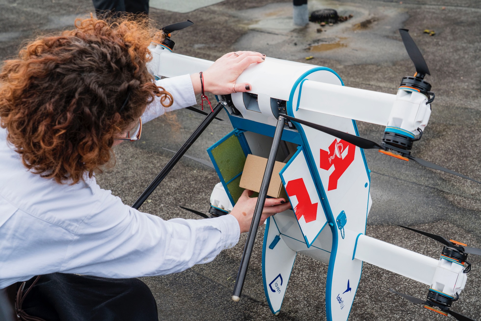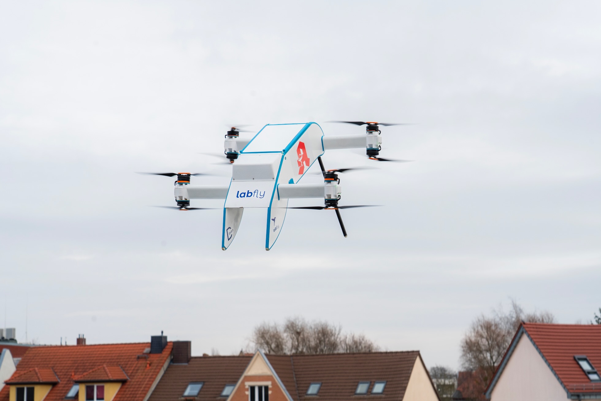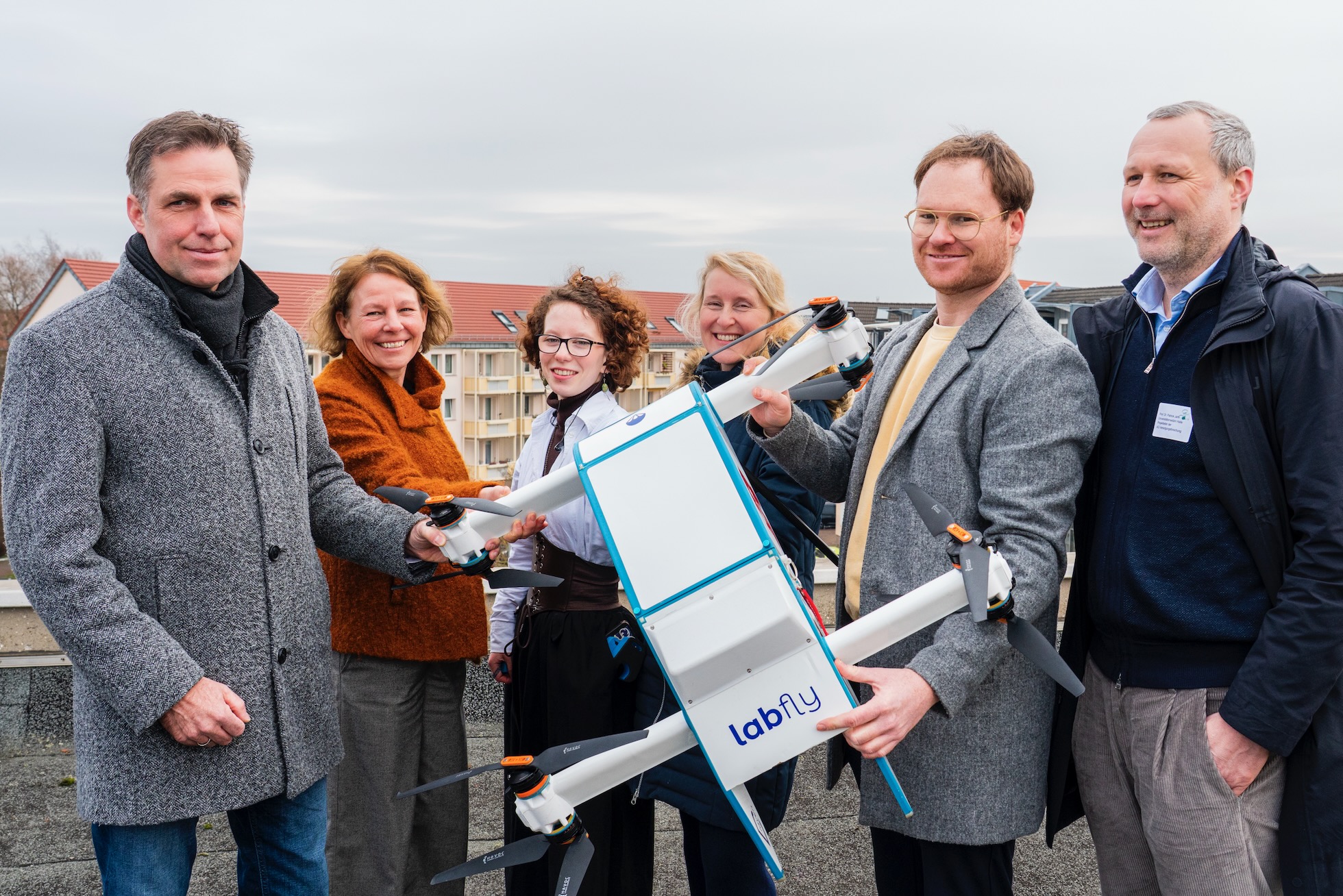 In Zukunft könnten dringend benötigte Medikamente per Drohne bis an die Haustür geliefert werden, im besten Fall innerhalb weniger Minuten. Dafür müssen Patient:innen dann lediglich ihr E-Rezept über eine App erfassen. Anschließend wird das entsprechende Medikament in der Apotheke verpackt und hebt kurze Zeit später ab. Am Zielort muss die Drohne nicht einmal landen. Sie verlässt lediglich die Flughöhe, sinkt auf circa zehn Meter über dem Boden und öffnet die Bodenklappe. Ein bruchsicherer Karton wird an der Zieladresse abgeworfen und die Drohne fliegt zur Apotheke zurück.