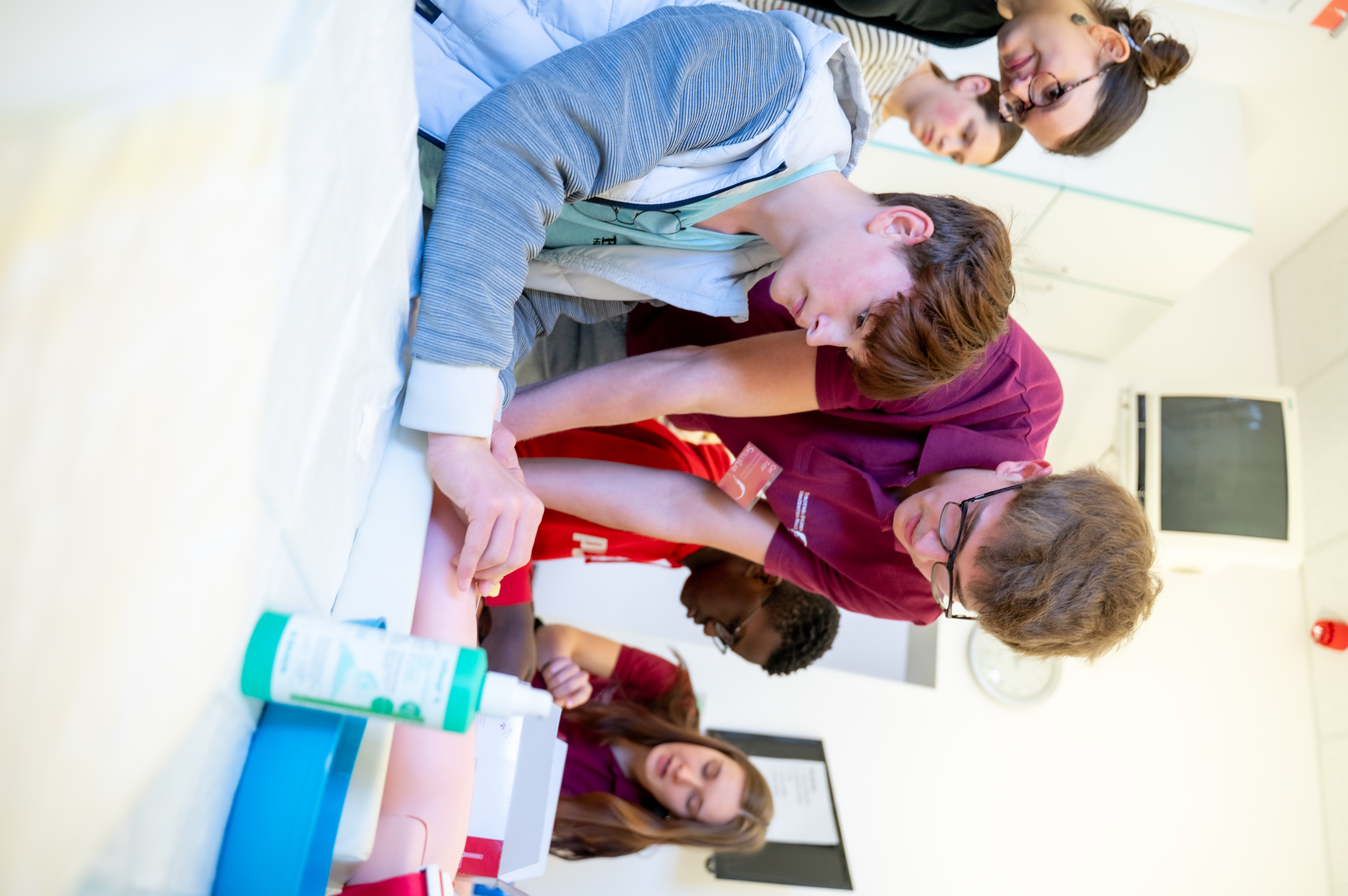 Die Auszubildenden der Fachrichtungen Operationstechnische Assistent:innen und Anästhesietechnische Assistent:innen hatten einen alten OP-Saal wiederbelebt und demonstriert, wie viele Handgriffe notwendig sind, um Patient:innen in Narkose zu versetzen. Gemeinsam wurde intubiert, mit den Kolleg:innen vom SkillsLab Blut abgenommen und auch der Fachbereich Mikrobiologie erkundet. Hier lernten die Schüler:innen in Schutzkleidung viele verschiedene Viren, Bakterien und Pilze kennen, durften pipettieren und mikroskopieren.