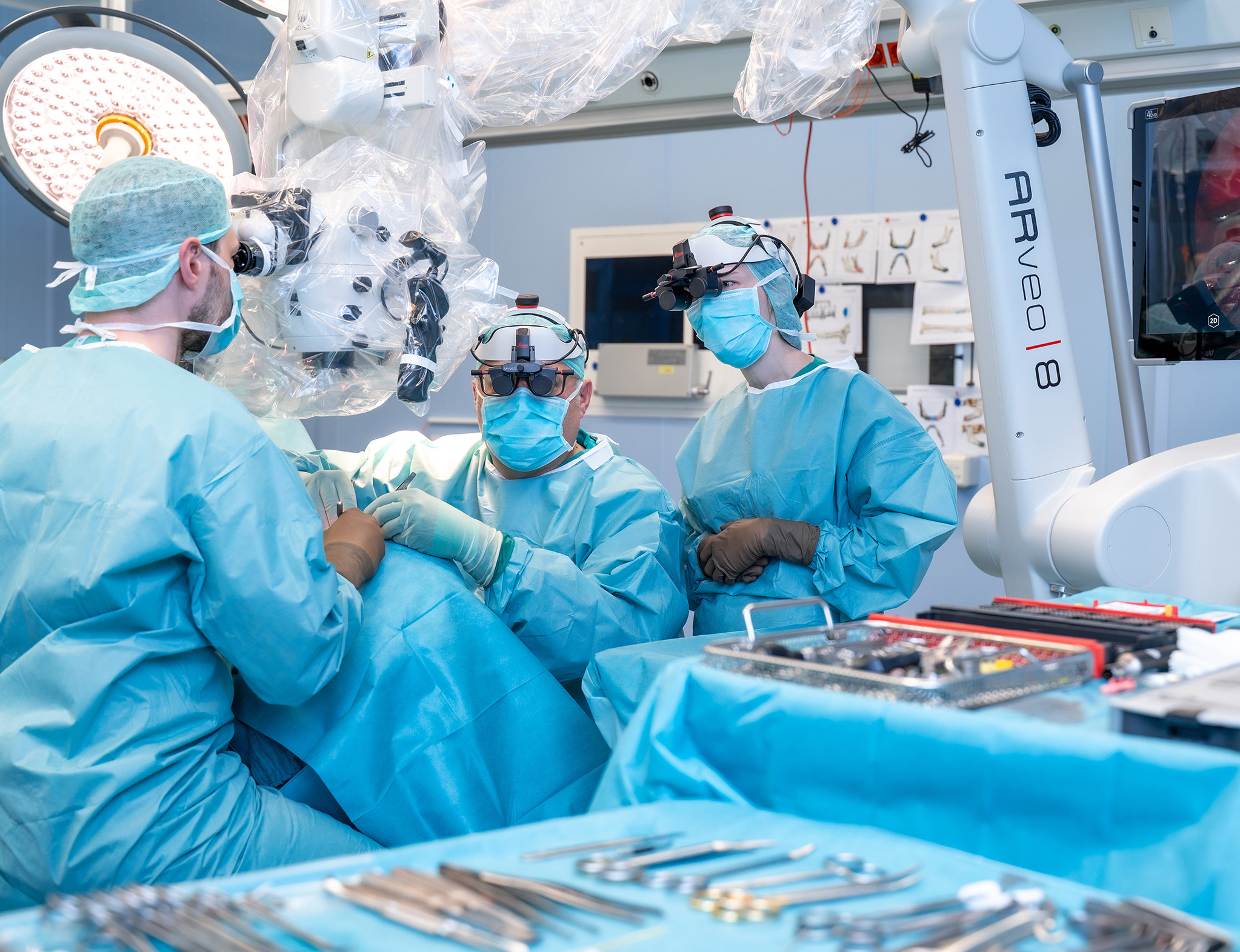 Das MyVeo-Headset erweitert das Bild aus dem Operationsmikroskop um eine digitale 3D-Ansicht mit Augmented Reality. So sehen Chirurg:innen während des Eingriffs nicht nur die präzise vergrößerte Operationsregion, sondern können mithilfe der Fluoreszenzbildgebung auch die Durchblutung kleinster Gefäße darstellen. Wichtige Zusatzinformationen lassen sich per Knopfdruck direkt ins Sichtfeld einblenden, ohne den Blick vom Operationsgebiet lösen zu müssen. Zum Einsatz kommt das neue System insbesondere bei Operationen von Tumoren, bei rekonstruktiven Eingriffen, feiner Nervenchirurgie sowie bei der Korrektur angeborener Fehlbildungen.