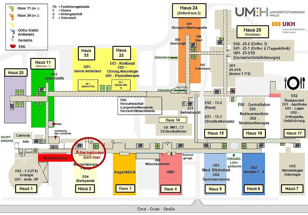 In diesem Bereich gibt es auch zwei Fahrstühle. Fahren Sie in die Etage E04, falls die Treppe nicht zusagt. Laufen Sie aus dem Fahrstuhl in Richtung Treppe und passieren Sie diese rechts. Nun gelangen Sie zur Blutspende.