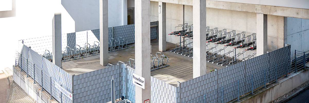Hier befindet sich die Fahrradgarage des UKH. Mitarbeiter: innen wird hier eine kostenfreie Möglichkeit geboten, ihr Fahrrad sicher abzustellen. Sie ist videoüberwacht und wird regelmäßig unangekündigt kontrolliert.