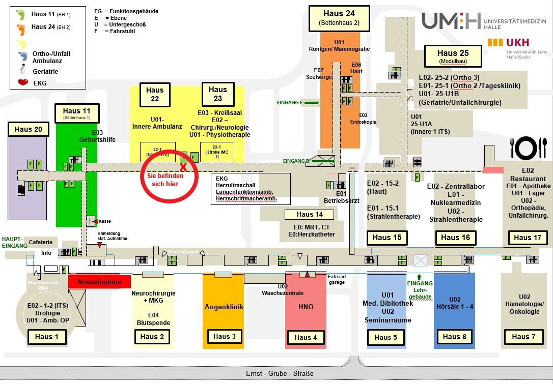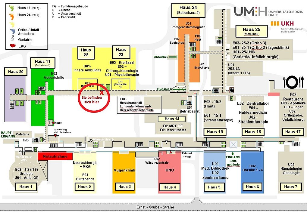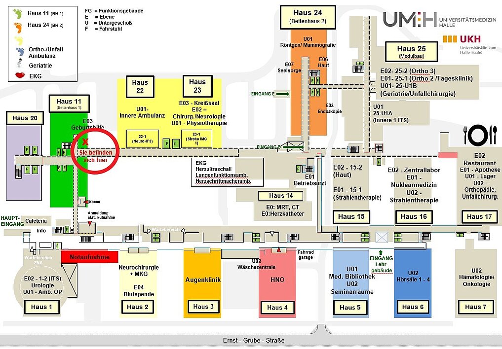 Nachdem Sie durch den Funktionaltrakt gelaufen sind, finden Sie hier auf der rechten Seite die Fahrstühle, die unter anderem auch zur Physiotherapie führen. Sie befindet sich eine Etage tiefer. Diese könnten Sie dann besuchen wollen, wenn Sie eins der vielen Angebote zur Gesundheitsförderung wahrnehmen wollen.